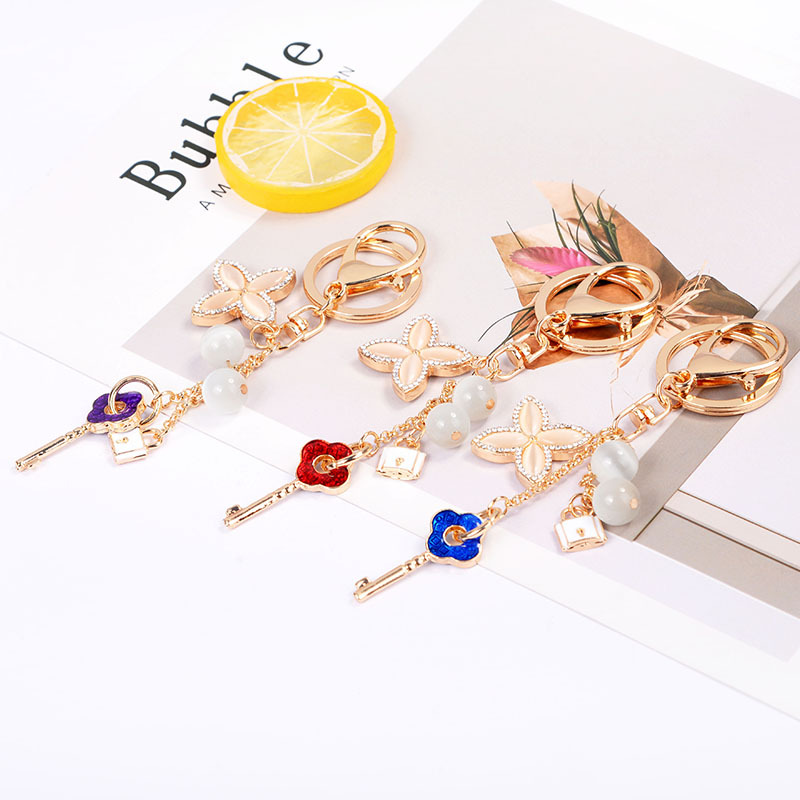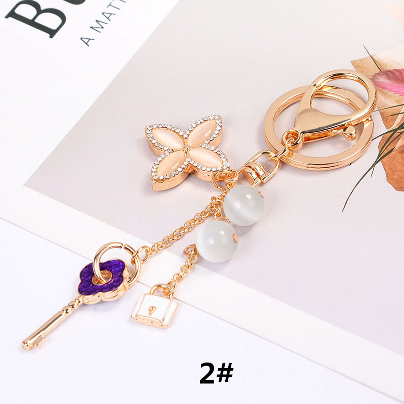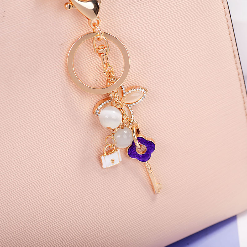 上品なゴールド色の花モチーフが美しいキーリングです。 鍵を付けても良し、バッグに付けても良し、使い方が色々! パールや小花のチャームが揺れる度に華やかさを演出します。 プレゼントにもお勧めの上質な仕上がりです。