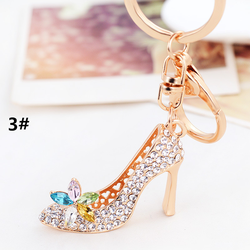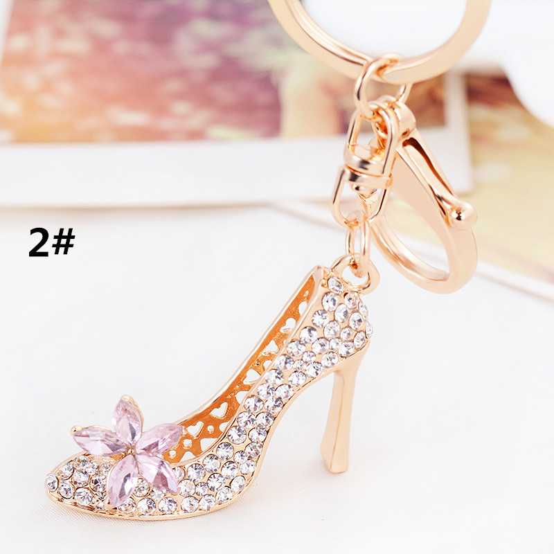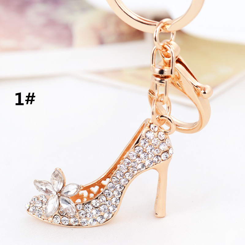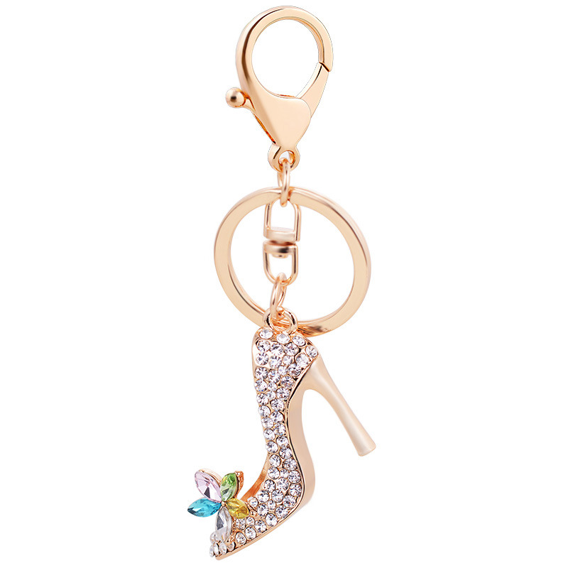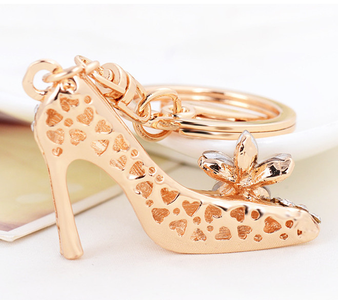 華やかなゴールドカラーのハイヒール型キーリングです。 鍵を付けても良し、バッグに付けても良し、使い方が色々! ラインストーンとお花の装飾が上品で、プレゼントにもお勧めです。