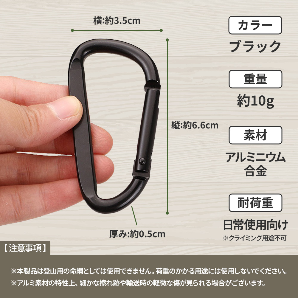 重量約10gの超軽量アルミ製カラビナ5個セット。縦6.6cm×横3.5cmのコンパクトサイズで持ち運びに便利です。