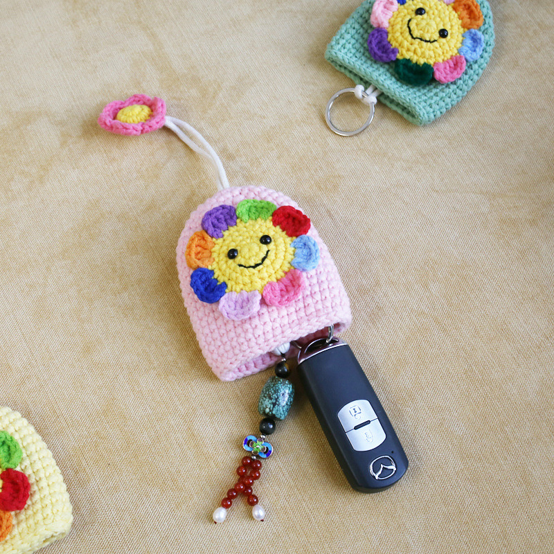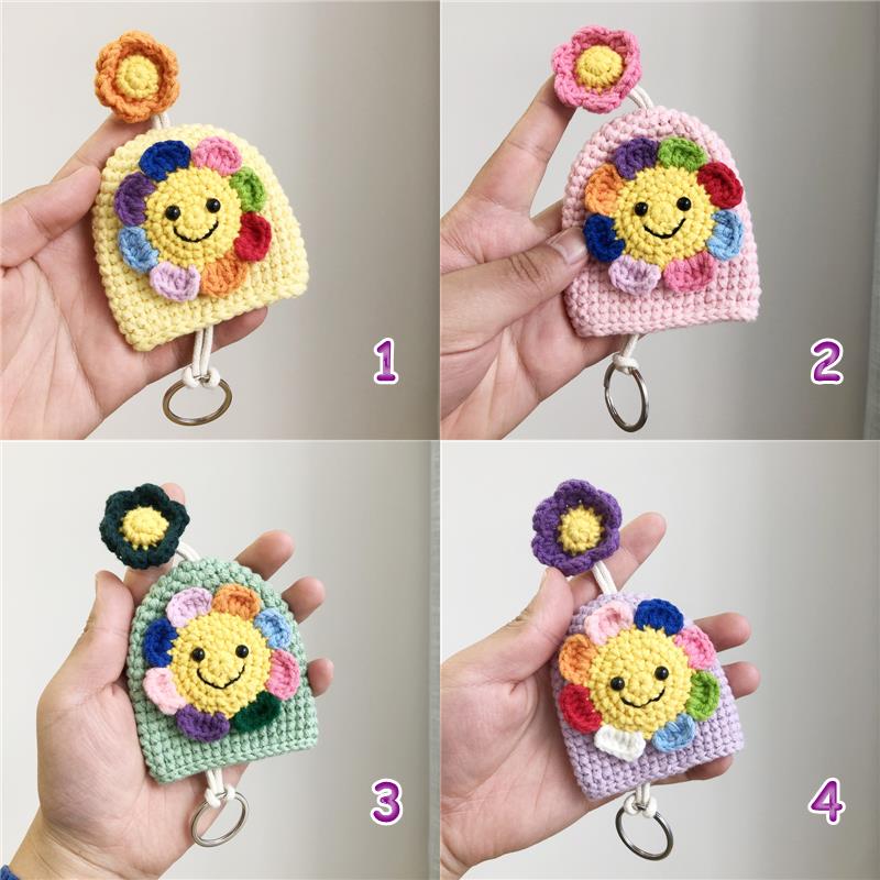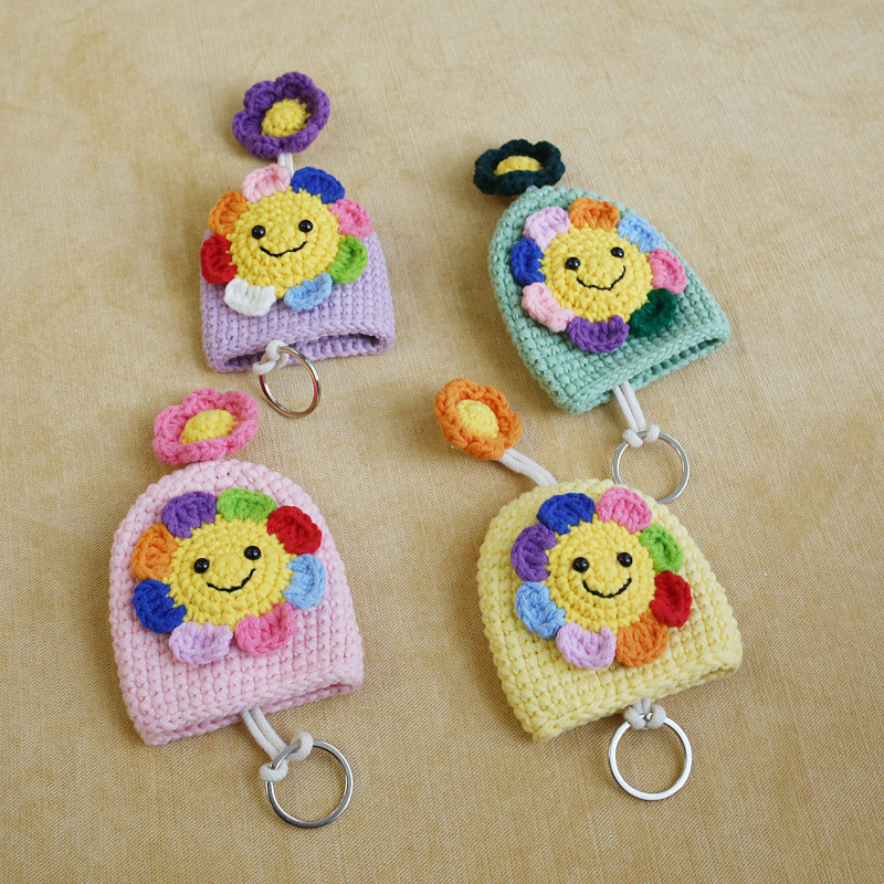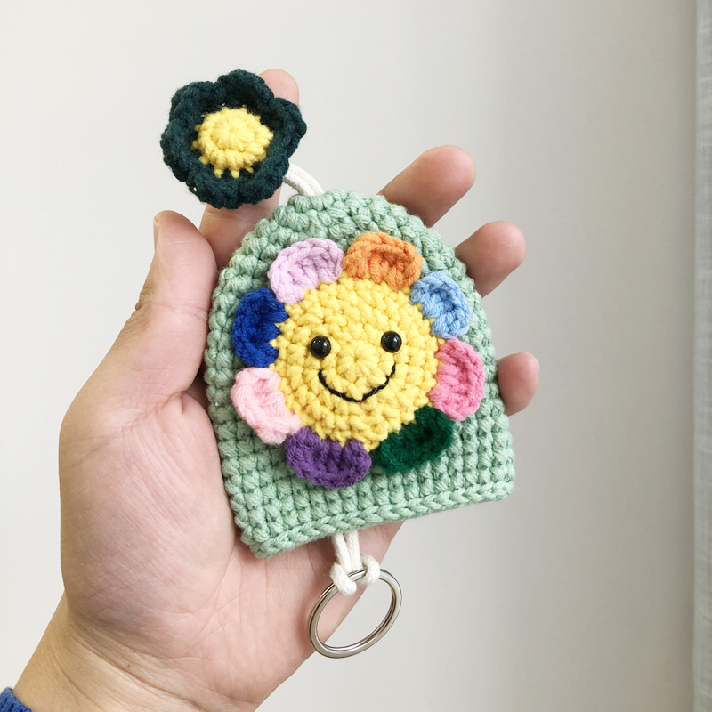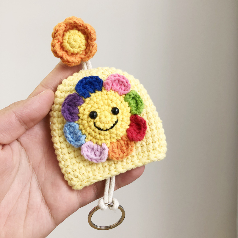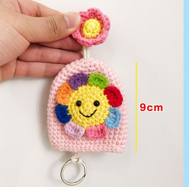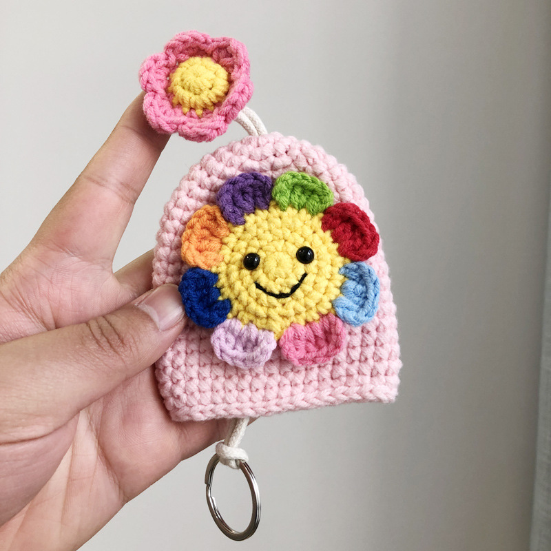 カラフルなお花の花びらが可愛いニコちゃん顔の手編みキーチャームです。 丁寧に手作りされた温かみのある仕上がりで、バッグや小物の装飾にぴったり。 キーリングとしても使える実用性も兼ね備えた、優しい色合いの手芸作品です。