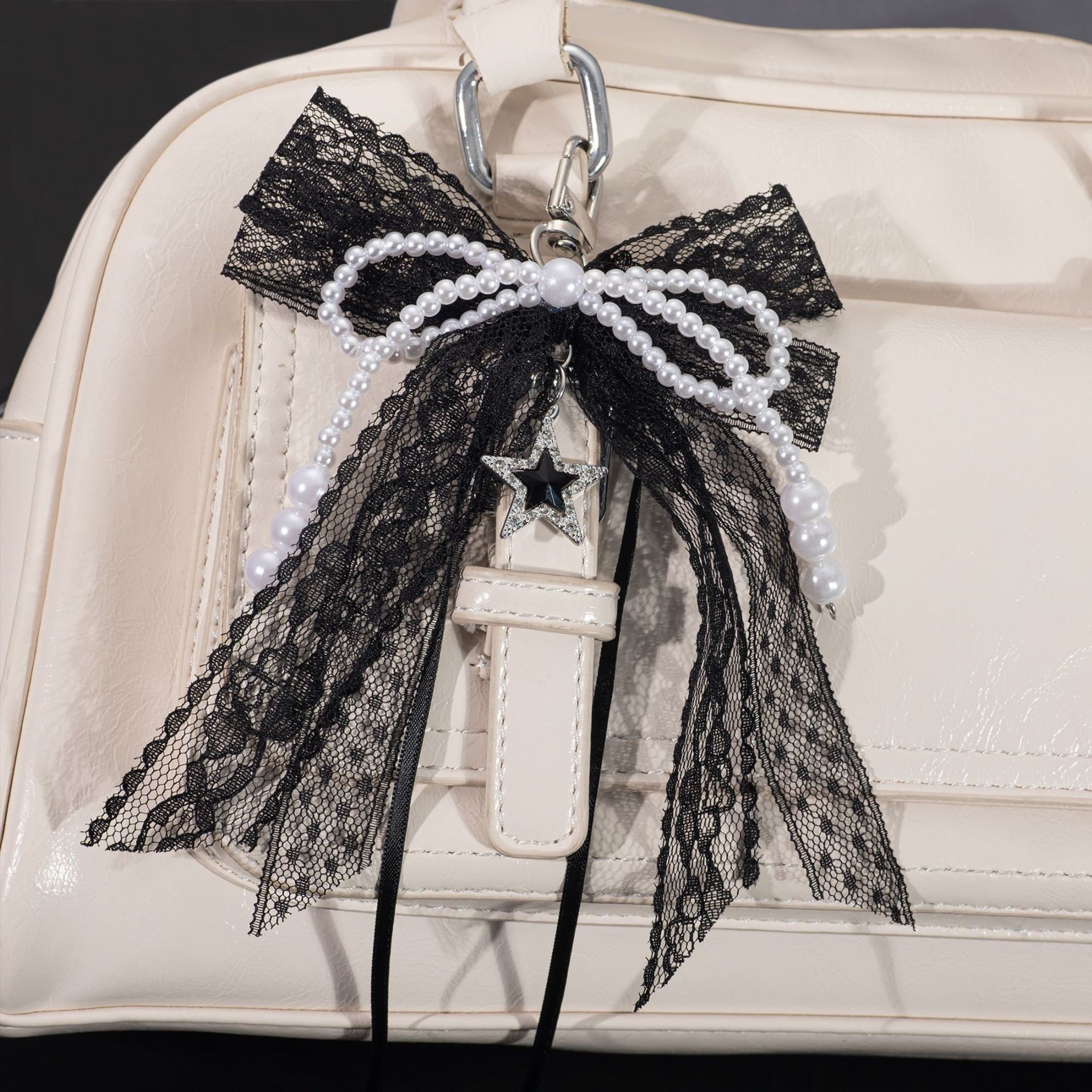 繊細なレース素材で作られた大きな蝶々のリボンが特徴のキーチャームです。 リボンの中心には上品なパールビーズがあしらわれ、星のモチーフが華やかさを添えています。 流れるようなリボンテープとパールチェーンが優雅に揺れ、バッグや鍵に取り付けるだけで女性らしさを演出します。 キーリングとしても使いやすく、日常使いから特別な日のアクセサリーとしてもおすすめの一品です。