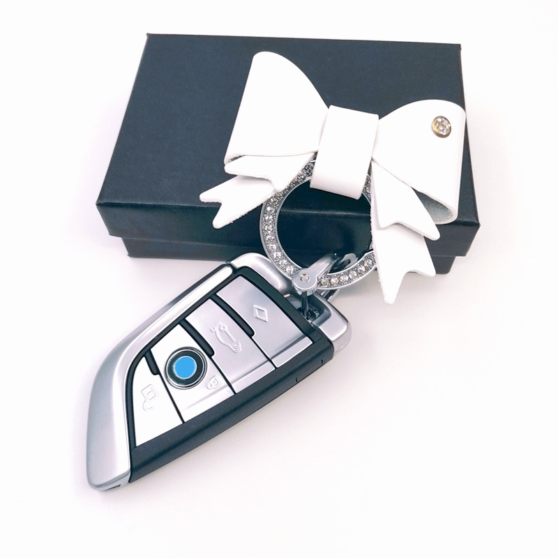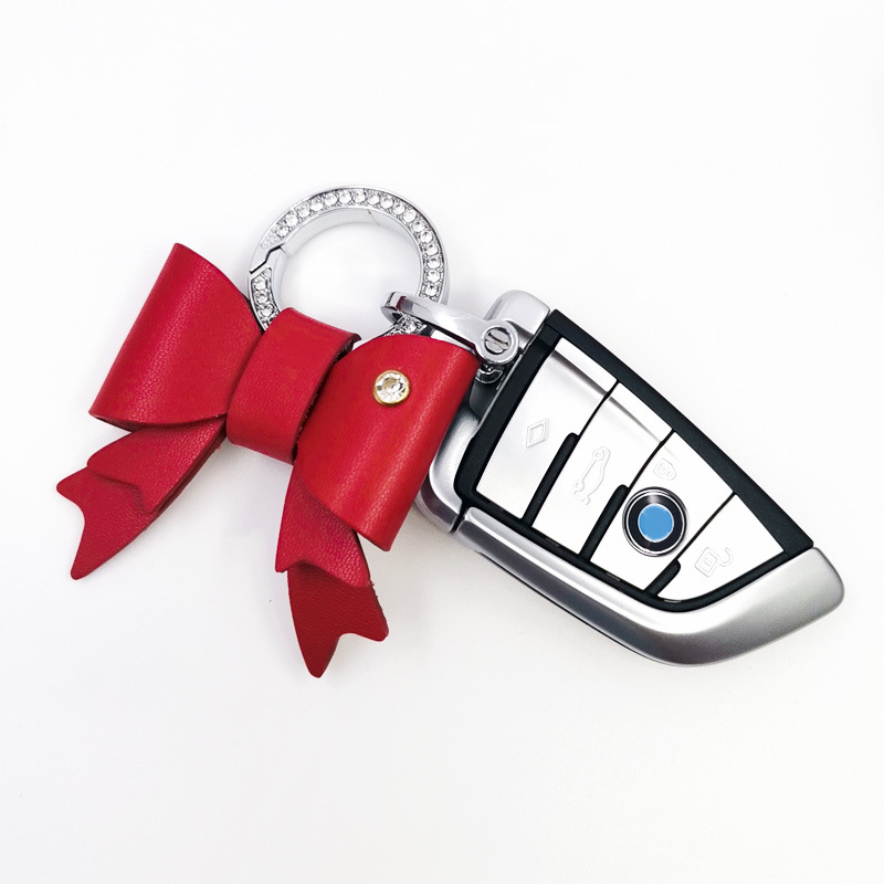 可愛らしいリボンモチーフが特徴的なキーチェーンです。 リボン部分は上質な合成皮革で仕上げられており、立体的で華やかな印象を与えます。 リング部分にはキラキラと輝く装飾が施され、高級感を演出しています。 バッグやポーチに取り付けて鍵を管理できるキーリングとしてはもちろん、アクセサリー感覚でお使いいただけます。 普段使いからギフトまで幅広くお楽しみいただける魅力的なアイテムです。